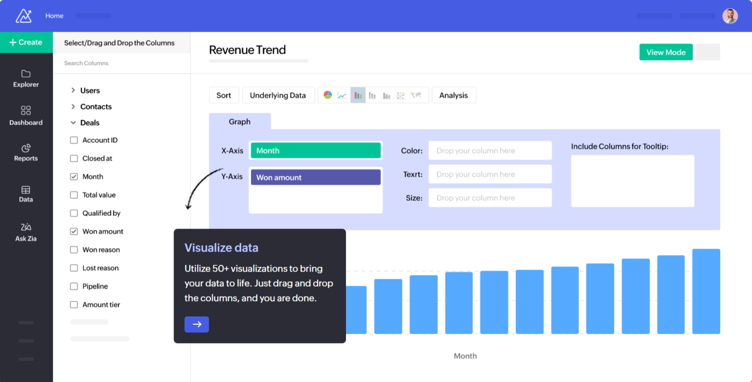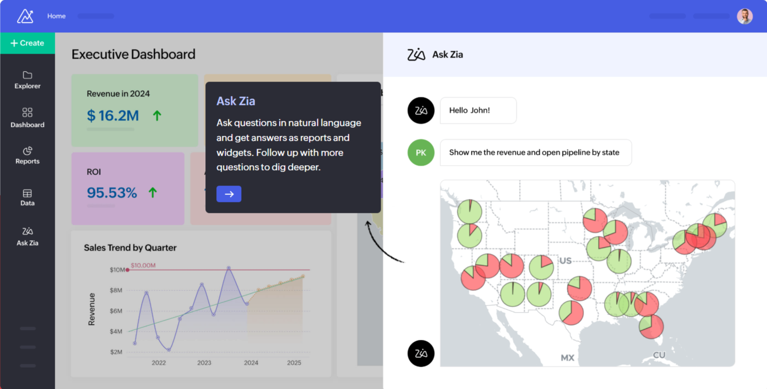 Zoho Analytics wspiera analizę historyczną, predykcję oraz identyfikację zmian w wynikach biznesowych. Pozwala to podejmować decyzje bardziej świadomie i lepiej planować kolejne działania.