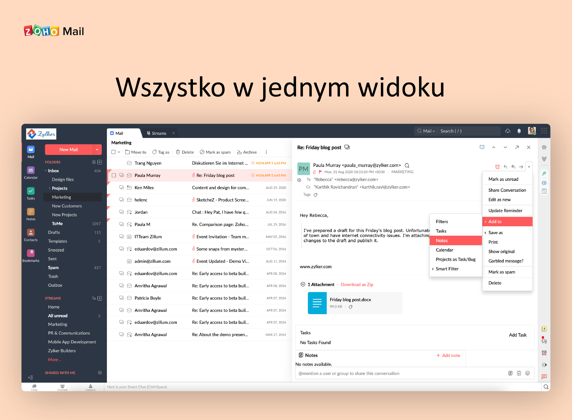 Zoho Workplace łączy e-mail, komunikację zespołową, pliki, dokumenty i spotkania w jednym pakiecie. Dzięki temu firma ogranicza chaos technologiczny, redukuje liczbę przełączeń między aplikacjami i upraszcza codzienną pracę zespołów.